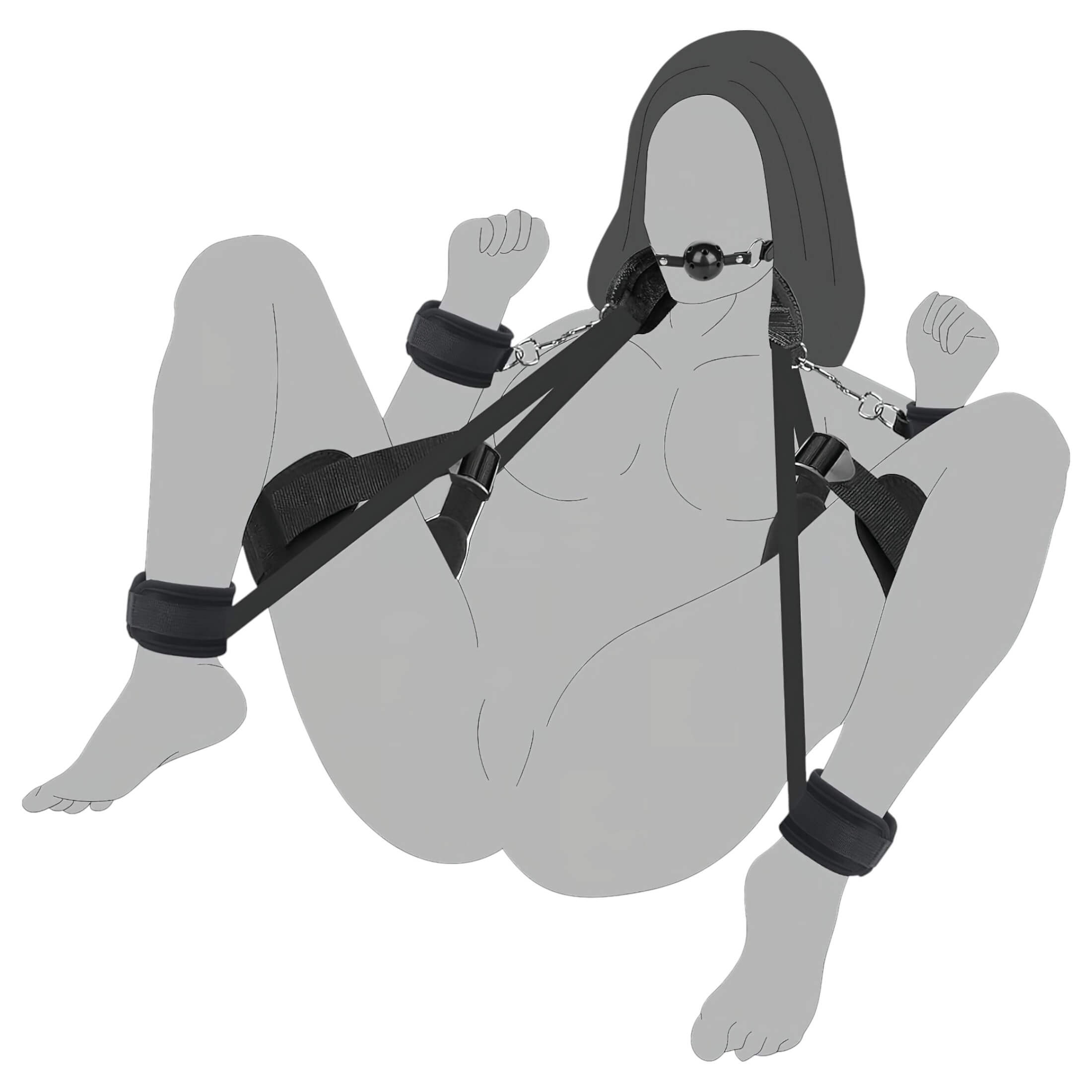 Rögzítse a nyak- és combpántokat, állítsa be őket a csatokkal, majd használja a boka- és csuklópántokat – végül rögzítse a szájpecket a teljes kontroll érdekében.