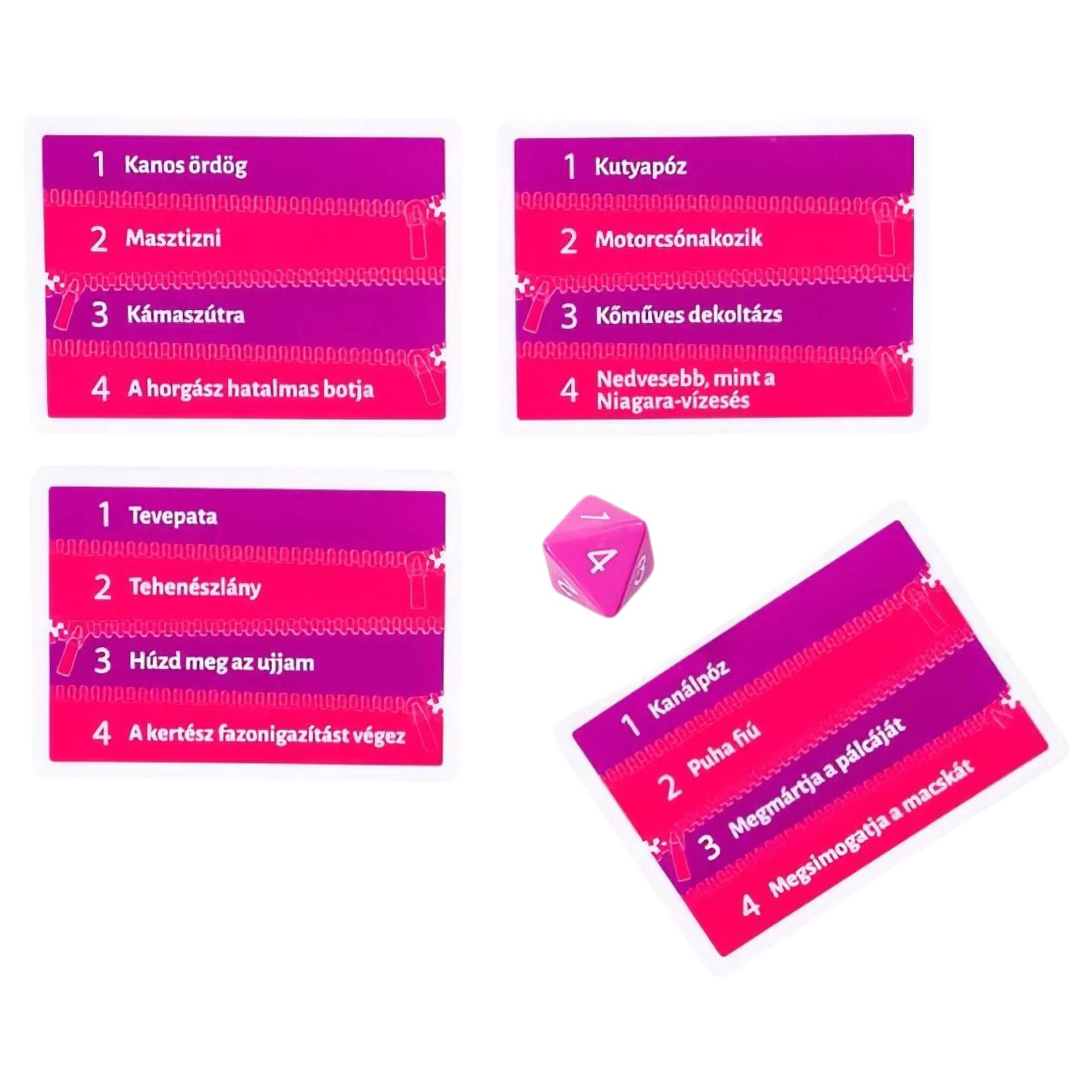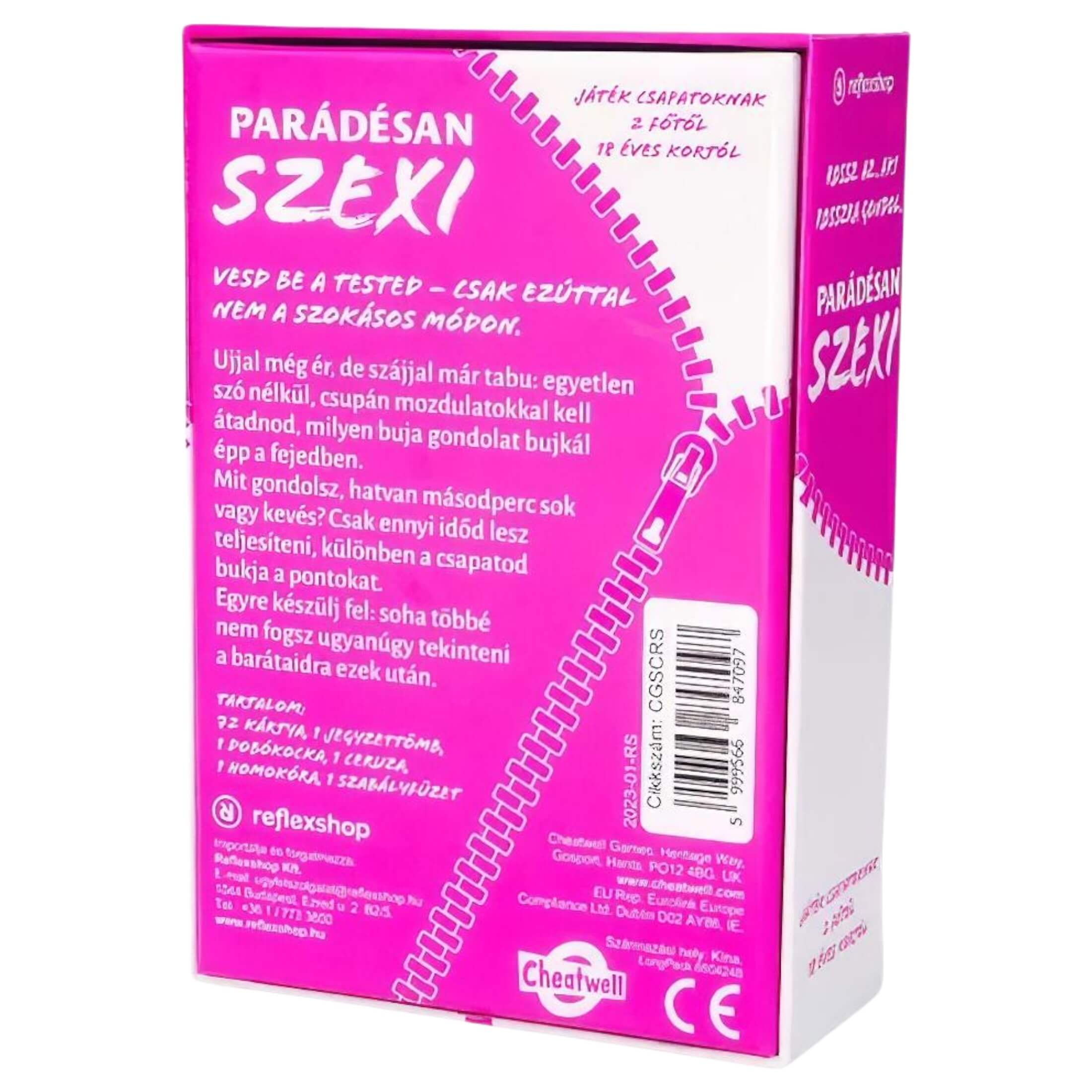 A Szexi Erotikus Parádé biztosan feldobja a házibulikat, leánybúcsúkat vagy a baráti összejöveteleket. Nem lehet beszélni, nem lehet hangokat kiadni – csak gesztikulálni! A pikáns kihívások, a 60 másodperces időkorlát és a csapatverseny gondoskodik a nevetésről és a forró hangulatról, ami kéz a kézben jár. Tökéletes választás, ha valami merészre, mégis játékosra vágysz.