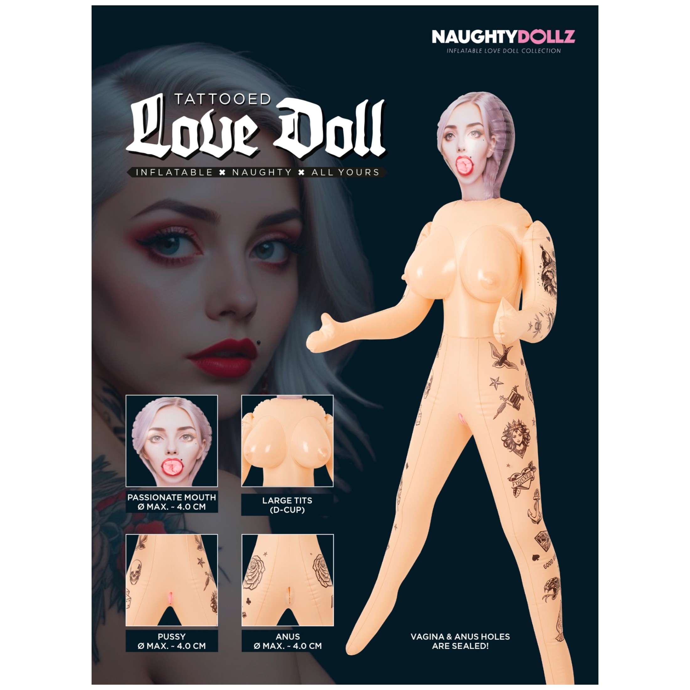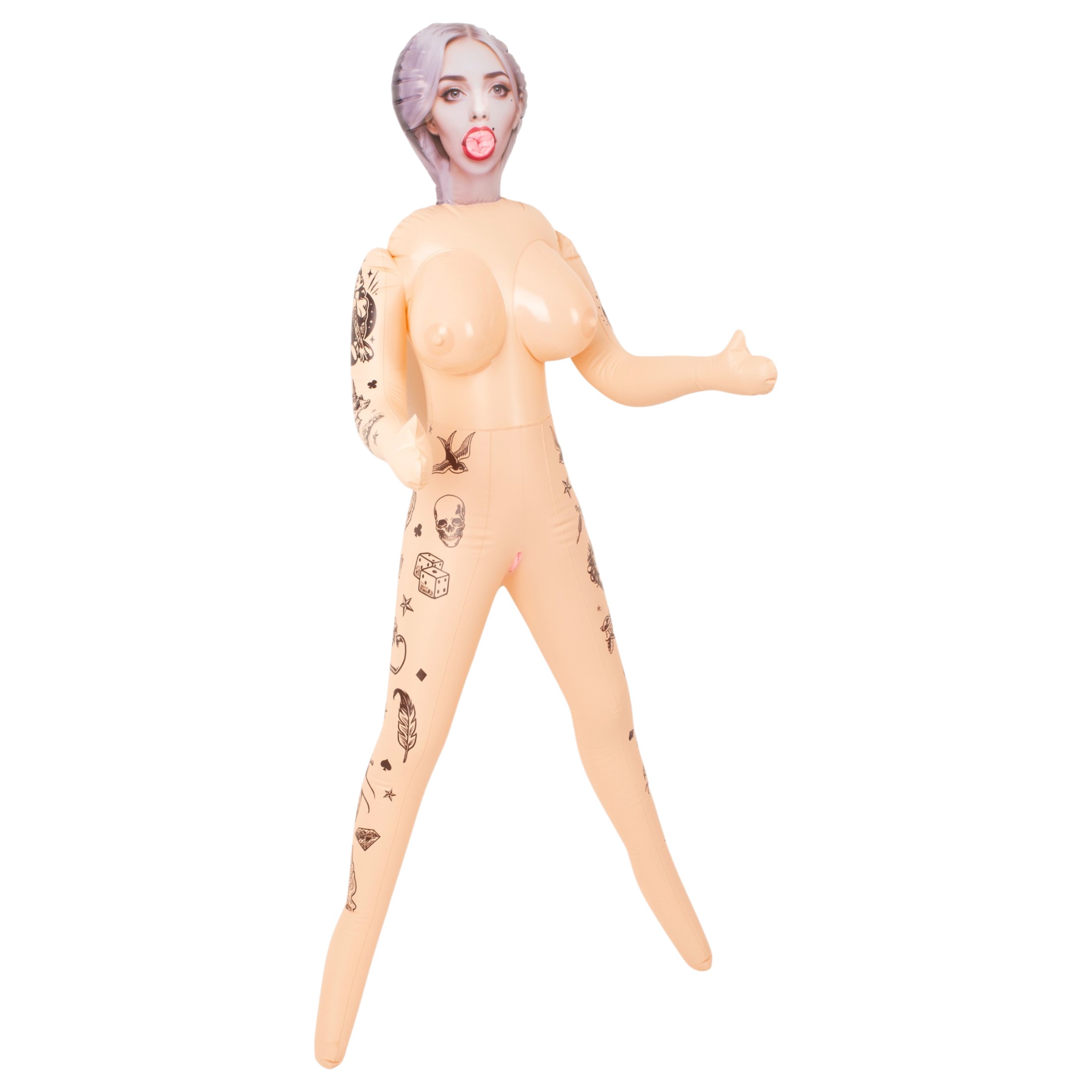 Ez a baba mindenkinek szól, aki egy szemet gyönyörködtető társat keres a magányos éjszakákra, amelyet mégis könnyű tárolni. A 152 cm-es életnagyságú figura álló és fekvő helyzetben is használható, karjain és lábain csinos tetoválások, valamint nyomtatott arc és haj található. Három nyílásával – száj, hüvely, végbélnyílás – széleskörű élményeket kínál, az anatómiailag kialakított méretek pedig valósághű behatolási mélységet biztosítanak. A PVC anyag könnyű, a csomagolás kompakt, a szállítás és tárolás diszkrét.
